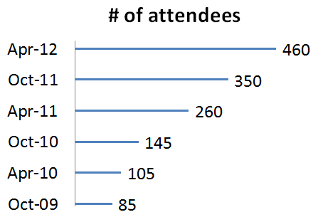 When I first got involved with the Twin Cities SharePoint Camp three years ago, I was thrilled to find an opportunity to learn from and network with other SharePoint enthusiasts. We started out small, with 75-100 people attending Saturday events at a local training center. But after adopting the SharePoint Saturday mantle and forming a leadership team to guide the events, we’ve grown to staggering proportions. Take a look at the growth curve in our number of attendees:
