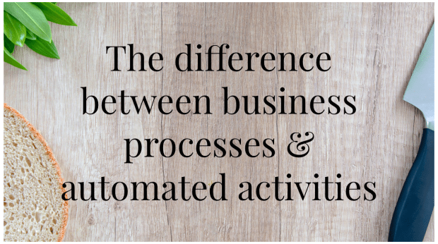 In simple terms, an automation is a ‘widget’ or task you optimize (e.g. building a macro or automating an email to be sent automatically by Salesforce). A business process is broader and deeper with a formally scoped business need and a series of automated steps that connect to form a complete cycle. Business processes are formally managed, supported, and adapted over time to meet emergent business needs.